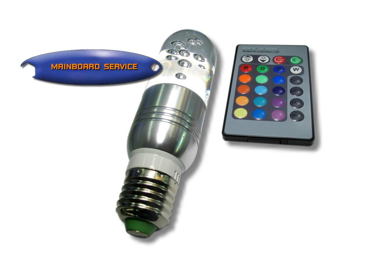 หลอดไฟ LED 3W ใช้กับขั้วเกลียวมาตราฐาน 220V ได้ทันที เปลี่ยนสีได้ด้วย Remote Control เหมาะสำหรับการตกแต่งห้องนอน ห้องพักผ่อน ปรับสีปรับอารมณ์, ผ่อนคลาย ด้วยความง่ายดายกับการควบคุมแสงไฟ ทั้งเปลี่ยนสีได้มากกว่า 24 สี หรี่ได้หลายระดับ เปิด-ปิด หรือแม้กระทั้งเปลี่ยนสีเองอัตโนมัติ ทั้งหมดนี้จาก รีโมทคอนโทรลตัวเล็กๆเพียงตัวเดียว