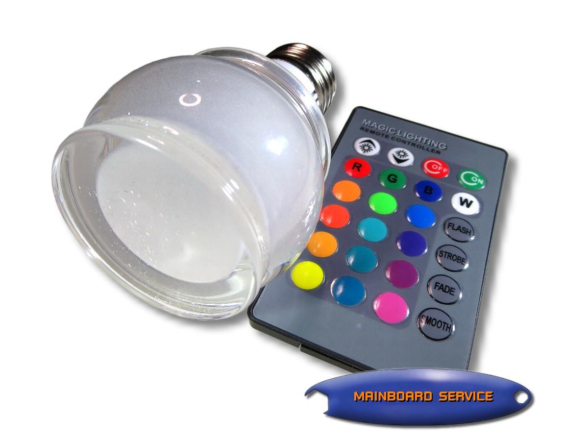 หลอดไฟ LED 3W ใช้กับขั้วเกลียวมาตราฐาน 220V ได้ทันที เปลี่ยนสีได้ด้วย Remote Control เหมาะสำหรับการตกแต่งห้องนอน ห้องพักผ่อน ปรับสีปรับอารมณ์, ผ่อนคลาย ด้วยความง่ายดายกับการควบคุมแสงไฟ ทั้งเปลี่ยนสีได้มากกว่า 24 สี หรี่ได้หลายระดับ เปิด-ปิด หรือแม้กระทั้งเปลี่ยนสีเองอัตโนมัติ ทั้งหมดนี้จาก รีโมทคอนโทรลตัวเล็กๆเพียงตัวเดียว